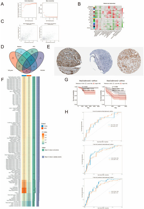 Screening of differential genes and construction of PCa DFI prognostic model. (A) Correlation analysis of R2 and Mean Connectivity with soft thresholds, respectively. (B) Heatmap of correlation analysis of different modules with convolutional cells. Red indicates a positive correlation, and green indicates a negative correlation. (C) Correlation scatter plots of gray modules with MSMB/Epithelial_cells and MSMB/Macrophage, respectively. (D) Venn diagram screening for core genes. (E) Images from left to right show the staining of GGCT, C2, and MRPL41 in PCa tissue. (F) Construction of PCa DFI prognostic model based on 117 algorithm combinations of 10 machine learning. Blue color represents TCGA database, and red color represents GEO database. The color gradient indicates the size of the C-index. Darker colors indicate larger C-index values. Green in Value indicates the mean C-index value in all cohorts, while blue indicates the mean C-index value in the validation cohort. (G) Survival analysis of high- and low-risk groups in the training and vali-dation sets. The red curve represents the high-risk group, and the gray curve represents the low-risk group. (H) ROC curves of StepCox[forward] + plsRcox algorithm at 1, 3, and 5 years in the training and validation sets. The blue curve indicates the AUC values in the TCGA database, and the red curve indicates the AUC values in the GEO database.