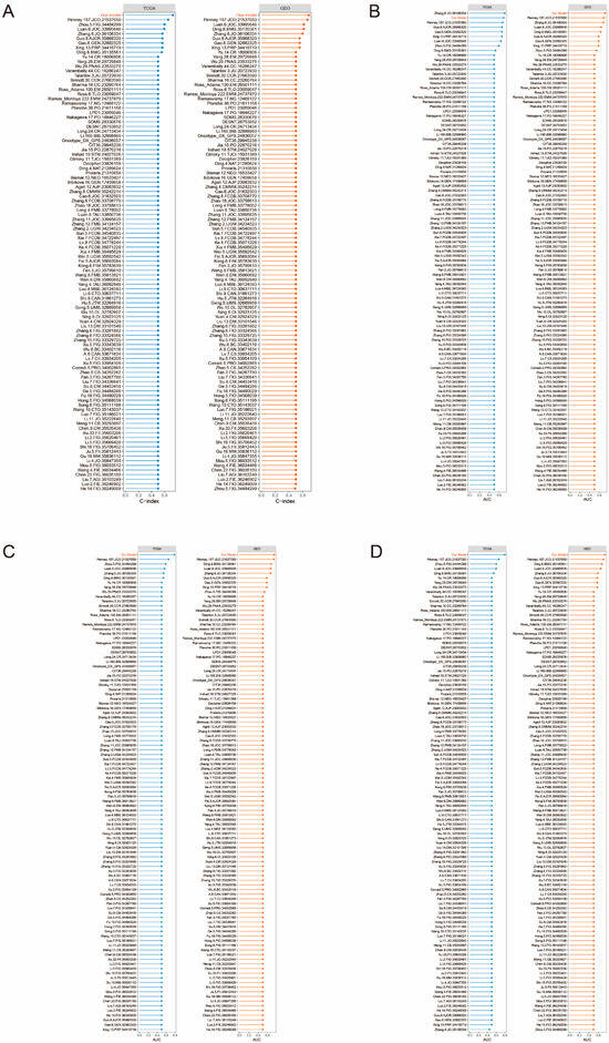 Inter-model comparison between training and validation sets. (A) Comparison of the C-index of our model with 102 published PCa prognostic models. (B–D) Comparison of predicted AUC values at 1, 3, and 5 years between our model and 102 published models.