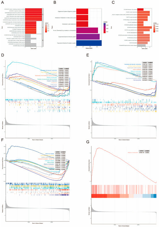 Gene enrichment analysis. (A) GO analysis of core genes. The color gradient indicates the magnitude of the q-value; the darker the color, the smaller the q-value. (B) KEGG analysis of core genes. The color gradient indicates the magnitude of the q-value; the redder the color, the smaller the q-value; the bluer the color, the larger the q-value. (C) DO analysis of core genes. The color gradient indicates the magnitude of the q-value; the darker the color, the smaller the q-value. (D–G) GSEA analysis of prognosis-related genes. Different colored curves represent different metabolic pathways.