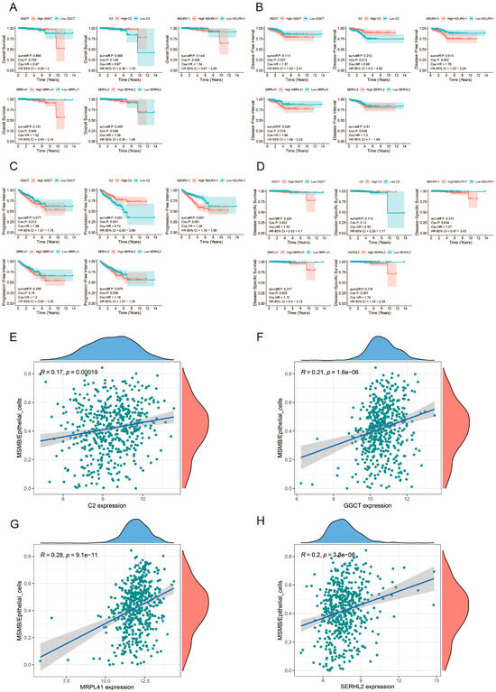 Prognostic analysis of prognosis-related genes in PCa and their correlation analysis with MSMB/Epithelial_cells. (A) OS survival analysis of prognosis-related genes in PCa. (B) DFI survival analysis of prognosis-related genes in PCa. (C) PFI survival analysis of prognosis-related genes in PCa. (D) DSS survival analysis of prognosis-related genes in PCa. The red color in Figure (A–D) represents the high-expression group of genes, while the blue color represents the low-expression group of genes. (E–H) Correlation analysis of prognosis-related genes with MSMB/Epithelial_cells. A larger R value indicates a stronger correlation, and a p-value less than 0.05 is considered statistically significant.