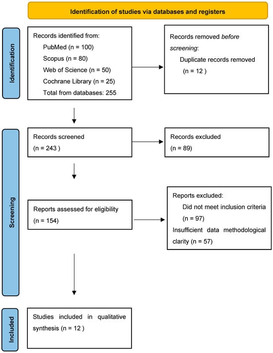 The systematic research identified a total of 255 records from PubMed, Scopus, Web of Science, and the Cochrane Library. After removing 12 duplicate records, 243 records were screened by title and abstract for relevance to the research question. At this stage, 89 records were excluded as they did not meet the inclusion criteria.