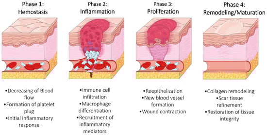 The skin serves as the body’s primary defense against external aggressions, acting as a barrier against physical, chemical, and microbial threats. It plays a crucial role in temperature regulation, nervous sensitivity, and maintaining overall homeostasis. In normal conditions, the skin’s regenerative process is a highly coordinated and intricate series of events involving four key phases: hemostasis, inflammation, proliferation, and remodeling—Figure 1. During the hemostasis phase, the body immediately responds to injury by constricting blood vessels and forming a blood clot to prevent excessive bleeding. This is followed by the inflammation phase, where immune cells migrate to the wound site to combat potential infections and clear away debris. The proliferation phase is marked by the growth of new tissue and the formation of new blood vessels, while epithelial cells migrate across the wound bed to restore the skin barrier. Finally, the remodeling phase involves the maturation and reorganization of collagen fibers to strengthen the newly formed tissue and restore the skin’s integrity [1,2]. This intricate process is often associated with challenges such as scar tissue formation, infections, chronic wounds, and impaired tissue regeneration, including the development of keloids or hypertrophic scars [3].