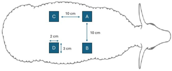 Four full-thickness skin lesions (critical lesions) with dimensions of 3 cm × 2 cm (6 cm2) were created on the back of each animal (Figure 2), separated by 10 cm. No treatment was applied to one of the lesions—the control lesion (sham). HNY-based spongy formulations were applied to two lesions—one consisting of GG and HNY (GG-HNY) and the other consisting of GG, HA, and HNY (GG-HA-HNY). In the fourth and final lesion, the cream FB002 was applied (cream). After inducing the lesions and applying the respective therapeutic approaches, the animals’ backs were covered with a dressing adapted for protection against environmental contamination, consisting of applying gauze compresses with petroleum jelly. Finally, anti-inflammatory (Meloxicam—Meloxidyl®, Ceva, Marseille, France, 0.5 mg/kg IM) and prophylactic antibiotherapy (Penicillin–Streptomycin—Lilimicina®, Ceva, 24,000–66,000 IU/kg) were applied every 72 h for a total of 3 administrations. In the first week after surgery, to reduce the risk of wound contamination, the animals were kept in individual metabolic cages and then returned to their communal group. Their dressings were changed every other day.