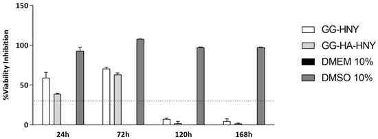 Percentage of cell viability inhibition after the direct contact of L929 cells with GG-HNY and GG-HA-HNY up to 168 h. Results presented as Mean ± SEM. The dashed line represents the percentage of cell viability inhibition above which cytotoxicity is considered, according to ISO 10993-5:2009 [23], (30%).