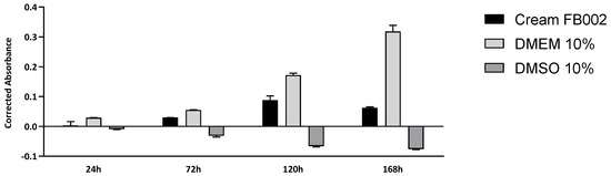 Corrected absorbance assessed by the PrestoBlueTM viability test for indirect contact between L929 cells cream FB002, up to 168 h. Results presented as Mean ± SEM.