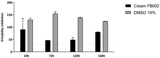 The values for cytocompatibility between L929 cells and cream FB002 can be found in Figure 5 and Table S3 and Table 3. Additionally, the percentage of inhibition of cell viability, normalized to the control group, was also determined, as shown in Figure 6 and Table S4.
