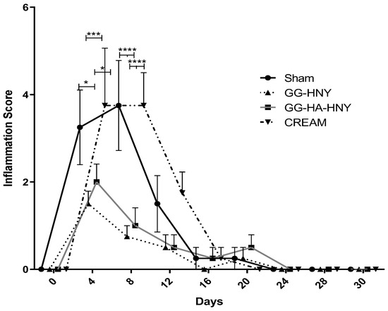 The inflammation score is based on the assessment of parameters such as purulent secretion, presence of erythema, extent of the region with erythema, and presence of edema and swelling—clinical indicators of an inflammatory process. After assigning a score of 0 immediately after the surgical intervention, it is possible to observe a peak of the inflammatory process occurring between days 4 and 8 after lesion induction in all therapeutic groups. This is followed by a sharp decrease in the following days, consistently showing an absence of inflammation from day 20 onward. As inflammation is the first of the three necessary phases for cutaneous healing, its occurrence immediately after lesion induction is expected. The established inflammation in the sham and cream groups is visibly more intense than in the groups that received the honey-based spongy formulation. Significant statistical differences are observed on day 4 between the sham group and the GG-HNY group (p = 0.0140) and between the cream group and the GG-HNY (p = 0.0008) and GG-HA-HNY (p = 0.0140) groups. Similarly, on day 8, significant differences are observed between the sham group and the GG-HNY and GG-HA-HNY groups (p < 0.0001) and between the cream group and the GG-HNY and GG-HA-HNY groups (p < 0.0001). These results support the macroscopic observation in which the sham and cream groups appear to be in a more advanced stage of healing on these days compared to the remaining groups.