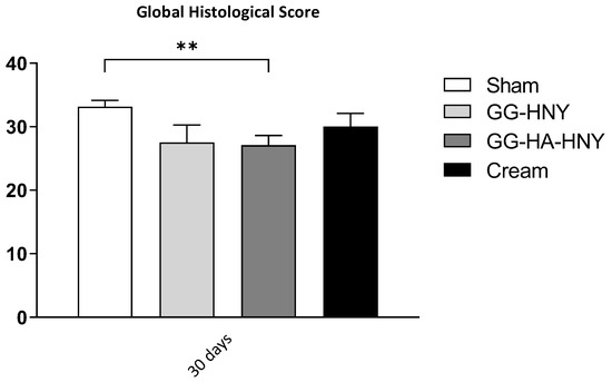 In all therapeutic groups, a decrease in the closure rate was observed, graphically appearing as a negative trend. This phenomenon is related to a slight separation of the wound edges in the first days after induction, secondary to marked scar retraction typical in sheep. The group in which more pronounced scar retraction was observed is GG-HA-HNY, where the closure rate values were lower on day 4 after the lesion. From day 4 onward, a progressive increase in the closure rate of the lesions was observed in all groups, corresponding to the closure of the wounds. In all groups, a positive closure rate was observed, meaning a lesion of smaller dimensions than those induced surgically between day 16 and day 20. At the end of the study period, all therapeutic groups presented closure percentages of lesions between 93% and 95%. Statistically significant differences were observed between groups on day 12 and day 16, in the former between the sham group and the GG-HNY (p = 0.0073) and GG-HA-HNY (p = 0.0004) groups, and in the latter between the sham group and GG-HNY (p = 0.0177) and GG-HA-HNY (p = 0.0004), and between the cream group and GG-HNY (p = 0.0232) and GG-HA-HNY (p = 0.0349).
