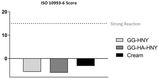 When evaluating the % cell viability inhibition, using the negative control group as a standard, it is worth noting that in the first two timepoints evaluated, 24 and 72 h, both groups, GG-HNY and GG-HA-HNY, induce a viability inhibition greater than 30%, an effect that decreases greatly at the final timepoints, 120 h and 168 h, in which the toxic effect is below the threshold considered for the establishment of cytotoxicity according to ISO 10993-5:2009 (30%). These results allow us to establish that, under the presented test conditions, the compounds under study are cytotoxic in the acute phase, after initial contact with cells, probably inducing initial cell adhesion cell proliferation restrictions. This negative effect seems to disappear over time due to cellular adaptation mechanisms, making them suitable for application in long studies and in complex and time-consuming regeneration processes such as those of the skin. DMEM 10% consistently demonstrated a % of cellular inhibition greater than 30%, as expected.