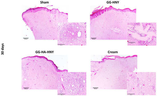In the sham, GG-HNY, and GG-HA-HNY groups, no significant differences in size are observed until day 8. In the cream group, a reduction in lesion dimensions seems to be identified by day 8. From day 12 onward, a progressive reduction in lesion dimensions is observed in all groups, with nearly complete closure by day 28 and total closure by day 30. Until day 16, the groups receiving spongy formulations exhibited a darkened coloration unrelated to the lesion itself but associated with the dehydrated sponge, which presented the observed appearance until removed from the lesion site while the regenerative process occurred in depth. Both the sham and cream groups showed a healthy hemorrhagic bed as early as day 4, indicative of a correct healing process, resulting in a faster reduction in lesion dimensions for these groups. The macroscopic appearance was similar for all therapeutic groups by day 30.