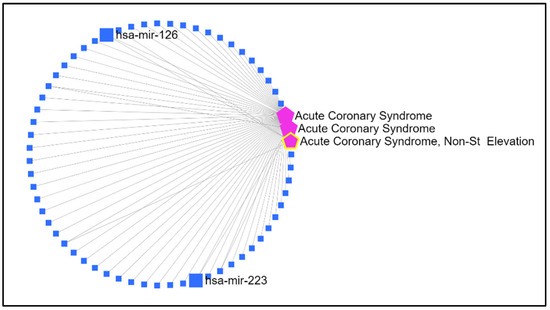 A schematic representation of the network of miRNAs associated with ACS developed using the miRNet database (https://www.mirnet.ca/miRNet/home.xhtml) (accessed on 26 October 2022). The pink pentagons represent the disease (ACS); the squares represent the miRNAs of interest; the lines represent interactions between miRNAs and the disease.