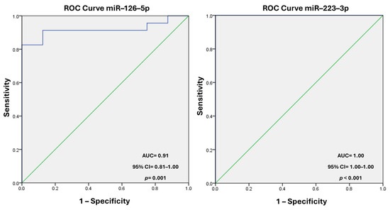 ROC analysis demonstrated high diagnostic potential, with AUC values of 0.918 for miR–126–5p 95% CI = 0.818–1.00, p = 0.001, while for miR–223–3p, the AUC was 1.00 (95% CI = 1.00–1.00, p < 0.001), indicating that miR–223–3p has an excellent ability to discriminate between TIMI 0 and TIMI 3 patients (Figure 3).