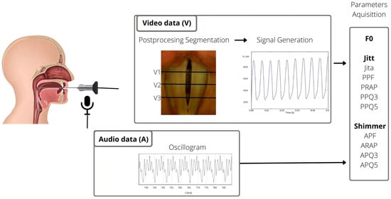 A schematic illustration of the examination process with the rigid endoscope using high-speed videoendoscopy (V) with the simultaneously recorded audio data (A) resulted in the parameter acquisition as listed below: F0, Jitter and its measures (Jita, PPF, PRAP, PPQ3, and PPQ5), and Shimmer and its measures (APF, ARAP, APQ3, and APQ5). The parameters were calculated for three glottal widths, V1—posterior, V2—middle, and V3—anterior, and simultaneously recorded audio data (A).