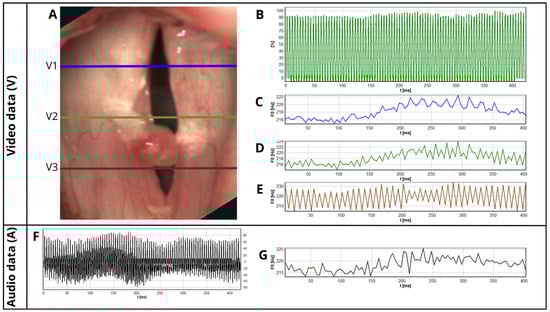 Data obtained during the HSV examination with the simultaneously recorded audio signal—an example of subject with polyp of the right vocal fold. Video data (V): (A) image of the glottis with marked glottal widths for the analysis; V1 (blue line)—posterior, V2 (green line)—middle, V3 (brown line)—anterior. (B) Middle glottal width waveform V2 (green line) with detected cycles marked as the green pointers in the bottom of the graph. (C) Fundamental frequency (F0) in time for the posterior glottal width V1 (blue line). (D) Fundamental frequency (F0) in time for the middle glottal width V2 (green line). (E) Fundamental frequency (F0) in time for the anterior glottal width V3 (brown line). Audio data (A): (F) oscillogram with detected cycles marked as the black pointers. (G) Fundamental frequency (F0) in time for the audio data.