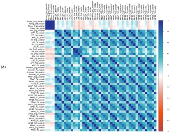 As observed in the whole group, high correlations (~0.9) were found within the Jitter-related parameters describing period perturbations, particularly between the same glottal widths (anterior–anterior, middle–middle, and posterior–posterior). Moderate correlations were noted between different glottal widths within the Jitter group. Shimmer-related parameters, which describe amplitude perturbations, showed comparable trends.