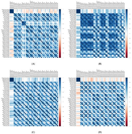 Heat maps showing correlations between kymographic parameters based on the high-speed videoendoscopy (HSV) including different glottal widths (anterior, middle, and posterior) and parameters based on simultaneously recorded audio signals (A) for different groups of patients. Heat map scale on the right side of the figure: dark blue, high positive correlation; white, no correlation; dark red, high negative correlation. (A) benign lesions; (B) premalignant lesions; (C) malignant lesions; (D) functional changes. Database with exact values of correlations and column legends included in the Supplementary Materials (Supplementary Tables S1–S4).