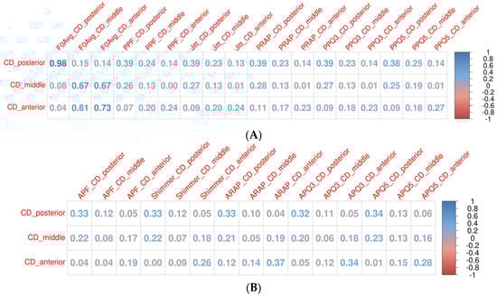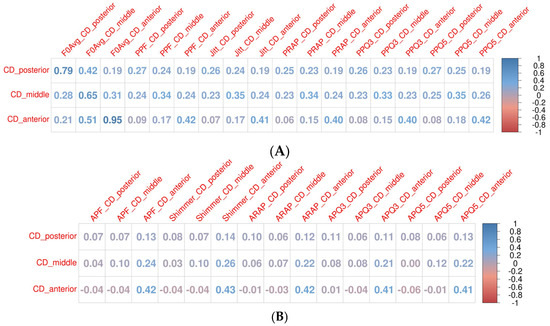 Whole group. Correlations between CD index (on the Y axis) describing the compliance between cycle detection for the high-speed video (HSV) for different glottal widths and audio data (described in detail in the Section 2) and the values of the kymographic analysis parameters (on the X axis) showing whether the difference in the number of detected cycles is related to the variability in the values of the calculated parameters for the audio and video data. Correlation scale on the right side of the figure: dark blue, high positive correlation; white, no correlation; dark red, high negative correlation. (A) Jitter group and F0; (B) Shimmer group.