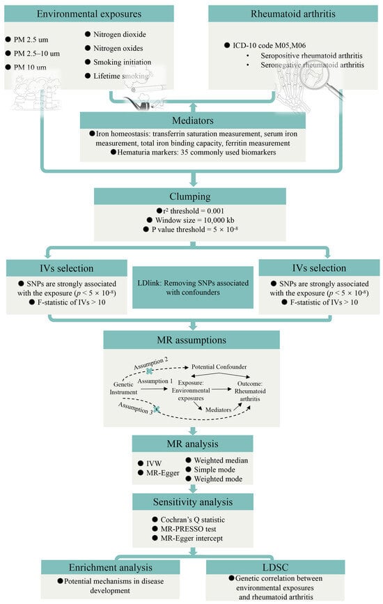 The workflow of our study is depicted in Figure 1. Our investigation was conducted employing a bidirectional two-sample MR approach, and our MR analysis was crafted in accordance with the STROBE-MR guidelines (Supplementary STROBE checklist). Initially, we implemented MR to examine the causal relationship between environmental exposures and RA. To better understand this connection, RA was categorized into seropositive and seronegative subtypes. For positive findings, further scrutiny was applied to their association with diverse RA subtypes. Thereafter, sensitivity analyses were undertaken to ascertain the robustness of our discoveries and to explore potential sources of heterogeneity. Subsequently, mediation MR analysis examined the mediating role of iron metabolism and hematuria markers in the linkage between environmental exposures and RA. This analysis allowed us to quantify the proportion of effects mediated by these factors, further illuminating underlying mechanisms, in tandem with enrichment analyses. Ultimately, we employed LDSC to probe potential genetic correlations between environmental exposures and RA, despite the possibility of non-causal relationships.