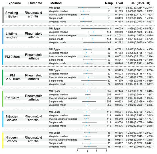 Effects of environment exposures on rheumatoid arthritis. Results from MR analyses showing the potential casual effects of environment exposures (smoking initiation, lifetime smoking, PM 2.5 μm, PM 2.5–10 μm, PM 10 μm, nitrogen oxides, and nitrogen dioxide) on rheumatoid arthritis.