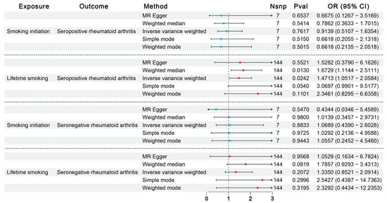 Effects of smoking on subtypes of rheumatoid arthritis. Results from MR analyses, showing the potential casual effects of smoking (smoking initiation, lifetime smoking) on seropositive and seronegative rheumatoid arthritis.