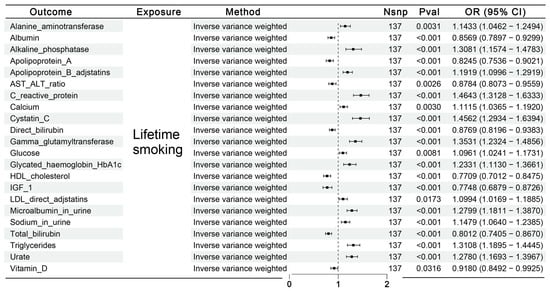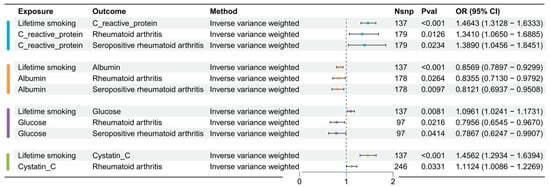 Further estimates elucidated the effects of these 22 potential hematuria markers related to lifetime smoking on the risk of RA or SPRA, as documented in Supplementary Table S4. Notable correlations included positive associations with RA, such as C-reactive protein (OR = 1.34, 95% CI: 1.07–1.69) and Cystatin C (OR = 1.11, 95% CI: 1.01–1.23). In contrast, albumin (OR = 0.84, 95% CI: 0.71–0.98) and glucose (OR = 0.80, 95% CI: 0.65–0.97) levels were negatively associated with RA risk. Similar trends consistent with RA were also observed for SPRA, concerning biomarkers such as C-reactive protein, albumin, and glucose.