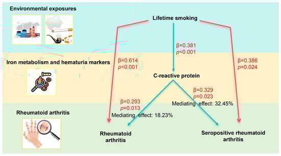 Mendelian randomization analyses show causal effects of iron metabolism and hematuria markers on environmental exposures and rheumatoid arthritis. The diagram displays the mediation mode of “lifetime smoking-C reactive protein-rheumatoid arthritis or seropositive rheumatoid arthritis” in two-step Mendelian randomization. Beta values (β) indicate the causal effect estimates using the inverse-variance weighted method (truncated at p < 0.05). Characters colored in red signify positive associations.