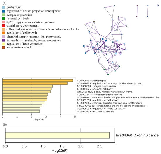 Upon transforming the SNPs significantly associated with smoking and RA into genes, enrichment analysis was conducted, detailed in Figure 7 and Supplementary Table S6. The top five clusters included postsynapse, regulation of neuron projection development, synapse organization, neuronal cell body, and the 8p23.1 copy number variation syndrome (Supplementary Table S7). Moreover, the results from KEGG pathway enrichment analysis suggested that the genetic influence of lifetime smoking on RA is predominantly concentrated in the axon guidance pathway.