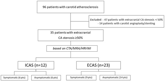 Flow-chart of patients included in this study. ICAS—intracranial atherosclerosis, ECAS—extracranial only atherosclerosis, CTA—CT-angiography, MRA—magnetic resonance angiography, HRVWI—high-resolution vessel wall imaging.