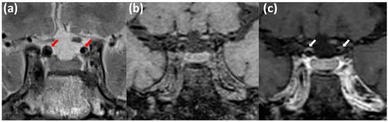 Patient ID#2. MRI signs of intracranial atherosclerosis of the brachiocephalic arteries: uneven stenosis of both internal carotid arteries (ICA) at the intracranial level, with signs of an eccentric pattern of contrast enhancement. MRI in T2 mode with high resolution (T2-HR) in the coronary (a), MRI T1 db f/s, before (b) and after (c) intravenous contrast injection with high-spatial-resolution T1-weighed imaging and suppression of the signal from bloodstream and fat. Red arrows—intracranial atherosclerotic plaque; white arrows—contrast enhancement in the vessel wall.