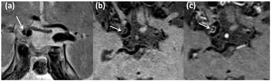 Patient ID#1. The MRI data correspond to stenosis of the left internal carotid artery (60–65%) with signs of an eccentric pattern of contrast enhancement. MRI in T2 mode with high resolution (T2-HR) in the coronary plane (a), MRI T1 db f/s, before (b) and after (c) intravenous contrast injection with high-spatial-resolution T1-weighed imaging and suppression of the signal from bloodstream and fat. White arrows—intracranial atherosclerotic plaque.