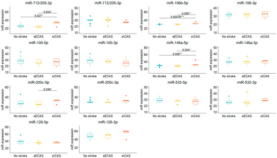 Box-plot showing miR expression in symptomatic patients with ICAS (sICAS), ECAS (sECAS), and patients without prior stroke. Shown are only significant pairwise differences (Holm–Bonferroni correction for multiple comparisons, p < 0.05). * p < 0.05; ** p < 0.01; *** p < 0.001.