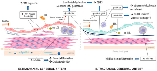 Atherosclerosis-related targets of studied miRs. Shown are cross-sections of extra-(left) and intracranial (right) arteries with anatomical features characteristic of each level (i.e., a thicker internal elastic lamina, absence of external elastic lamina and vasa vasorum, and low proportion of elastic fibers in intracranial vessels). LDL—low-density lipoprotein; ox-LDL—oxidized LDL; SMCs—smooth muscle cells; TIMP3—metalloproteinase inhibitor 3; * ox-LDL induced vascular damage.