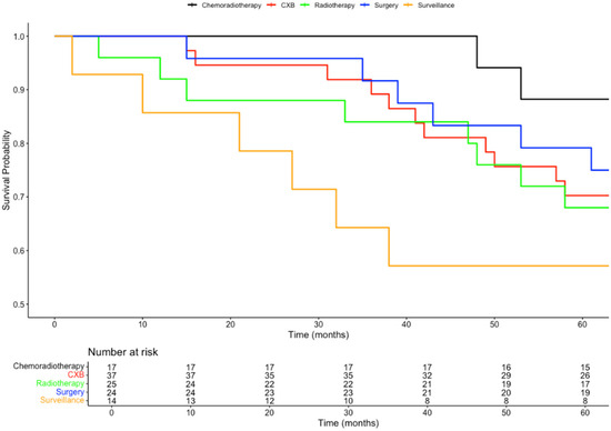 | Treatment | Follow-Up Months (Median, IQR) | Recurrence, n (%) | Time to Recurrence (Median, Months) | Deaths, n (%) | Time to Death (Median, Months) |
