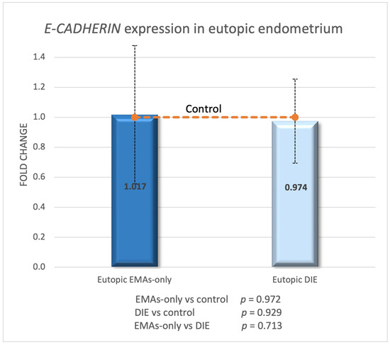 E-CADHERIN expression was measured in normal endometrium (control group, n = 8) and compared to eutopic endometrium from EMAs-only (n = 9) and DIE groups (n = 10). There was no change in eutopic endometrium between the EMAs-only and DIE groups compared to normal endometrium (Figure 1).