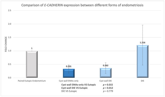 We then examined the mRNA expression of E-CADHERIN in women with endometriosis, namely in eutopic endometrium and paired endometriotic lesions. In women with EMAs-only, E-CADHERIN expression was nearly three times lower in the endometriotic cyst walls than in the matched eutopic endometrium (n = 9, p = 0.015; Figure 2).