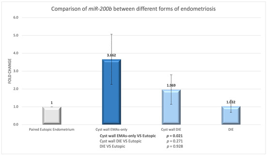 The expression of miR-200b was also examined in matched eutopic endometrium and endometriosis lesions. In the EMAs-only group, miR-200b was significantly over-expressed in endometriotic cyst walls compared to matched eutopic endometrium (p = 0.021; Figure 5).