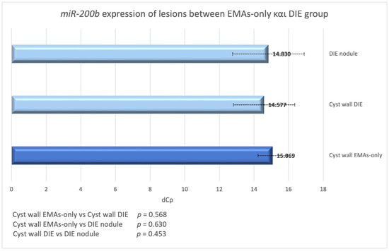 When we compared the endometriotic cysts of the EMAs-only and DIE group, we found no significant differences in miR-200b expression (p = 0.568; Figure 6). Additionally, no significant difference was found when we compared the endometriotic cysts of the EMAs-only group with the DIE lesions (p = 0.630).