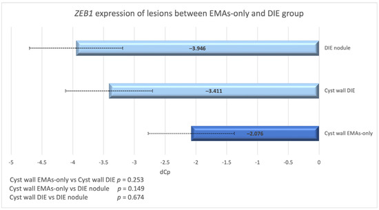 dCp value of ZEB1 in endometriotic cysts and nodules in DIE and EMAs-only group. There is a gradual increase in ZEB1 expression from the cyst wall of EMAs-only to the cyst wall of DIE and finally to the DIE nodule.