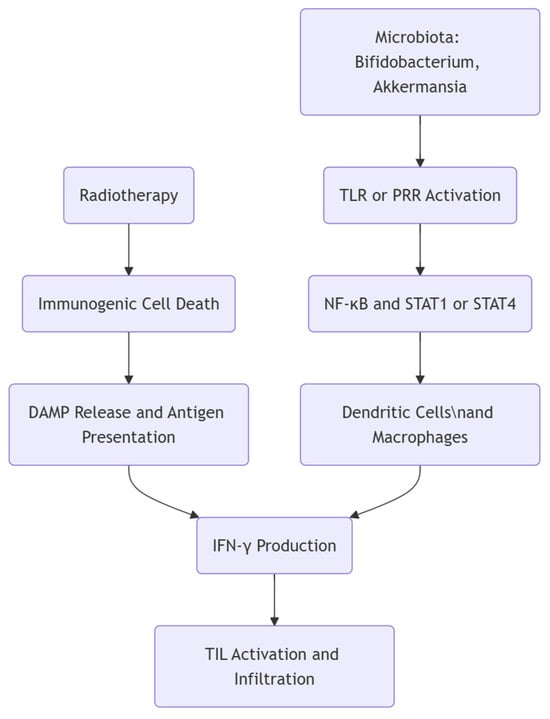 The interplay between immunity and the microbiota during RT is pivotal in determining clinical outcomes and potential side effects. From a radiobiological perspective, RT damages DNA in tumor cells and influences immune cells and the microbiota [,]. Damage to the intestinal epithelium and local tissue changes can disrupt the balance between beneficial and pathogenic microbes, promoting inflammation that may further shape antitumor immune responses [,]. Tumor-infiltrating lymphocytes (TILs) play a crucial role in mediating immune responses within the tumor microenvironment (TME), and recent evidence suggests that microbiota modulation can influence TIL recruitment and activity []. Specific bacterial species, such as Bifidobacterium and Faecalibacterium, have been associated with enhanced TIL activation through increased antigen presentation and cytokine signaling. One of the key cytokines influenced by the microbiota in relation to TIL activity is interferon-gamma (IFN-γ). IFN-γ is primarily produced by activated CD8+ cytotoxic T-lymphocytes and CD4+ Th1 cells, and its production can be enhanced by microbiota-driven stimulation of dendritic cells (DCs) and macrophages [,]. Certain gut bacteria, such as Bifidobacterium and Akkermansia muciniphila, can promote IFN-γ production by activating pattern recognition receptors (PRRs), including Toll-like receptors (TLRs), leading to downstream activation of nuclear factor kappa B (NF-κB) and STAT1/STAT4 pathways. RT can further amplify IFN-γ responses by inducing immunogenic cell death (ICD), which releases tumor-associated antigens and danger-associated molecular patterns (DAMPs), leading to dendritic cell activation and enhanced antigen presentation to T-cells [,,] (Figure 1). However, these effects can vary depending on tumor type, immune status, and the overall composition of the microbiota, highlighting the need for personalized approaches in microbiota-based therapies.