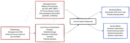 The figure illustrates the interplay among radiotherapy, the local tissue environment (including the gut microbiota), immune system responses, and factors that can modulate treatment outcomes.