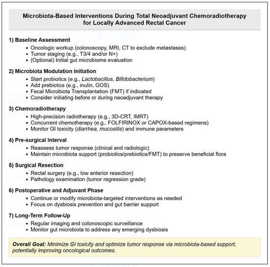 Microbiota-based interventions during total neoadjuvant chemoradiotherapy for locally advanced rectal cancer. This schematic outlines key time points—from baseline assessments, neoadjuvant chemoradiotherapy, and surgery, to the postoperative and long-term follow-up phases—where gut microbiota modulation (via probiotics, prebiotics, or fecal microbiota transplantation) can be implemented. The goal is to help preserve beneficial bacterial strains, reduce gastrointestinal toxicity, and potentially improve oncological outcomes.