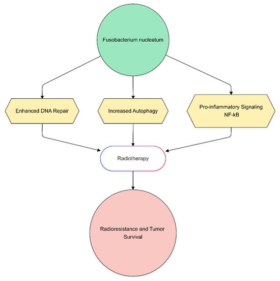 Proposed mechanism by which Fusobacterium nucleatum promotes radioresistance in colorectal cancer. The bacterium enhances DNA repair, increases autophagy, and triggers pro-inflammatory pathways (e.g., NF-kB) in tumor cells, ultimately reducing the effectiveness of radiotherapy.