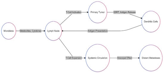 The figure depicts how changes in the gut microbiota influence an abscopal effect via SBRT for a systemic antitumor response. Microbial conditions activate the priming of immune responses in the lymph nodes by releasing cytokines and microbial metabolites. Meanwhile, the local deletion of tumor cells by SBRT releases tumor-associated antigens taken up by dendritic cells and cross-presented to CD8 cells. These activated T-cells undergo proliferation and expand into the systemic circulation, manifest cytotoxicity against the primary and non-irradiated distant tumor sites, and finally lead to the abscopal effect.