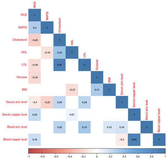 The evaluation of clinical data revealed that there was weak, positive collinearity between blood and serum copper levels and PASI (Spearmans ρ = 0.18 and ρ = 0.22, respectively) scores. In addition, serum zinc levels were negatively correlated with PASI (ρ = −0.1) and NAPSI (ρ = −0.21) scores. Serum zinc levels were also positively correlated with cholesterol (ρ = 0.24) and LDL (ρ = 0.24) levels (Figure 1).