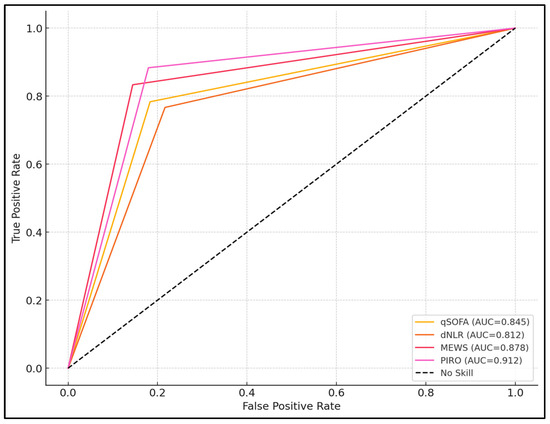 The Quick Sequential Organ Failure Assessment (qSOFA) score had an area under the curve (AUC) of 0.845, demonstrating high accuracy, with 78.33% sensitivity and 81.67% specificity, thus highlighting its effectiveness in predicting severe outcomes (p < 0.001). The derived Neutrophil-to-Lymphocyte Ratio (dNLR) also showed substantial predictive capability, with an AUC of 0.812, sensitivity of 76.67%, and specificity of 78.33% (p < 0.001). The Modified Early Warning Score (MEWS) exhibited a higher AUC of 0.878, alongside an impressive sensitivity of 83.33% and specificity of 85.61%, confirming its utility in clinical assessments (p < 0.001). The highest diagnostic accuracy was observed with the PIRO (Predisposition, Infection, Response, and Organ Dysfunction) score, which achieved an AUC of 0.912, with 88.33% sensitivity and 82.05% specificity, making it the most reliable scoring system among those tested for predicting severe OI (p < 0.001), as presented in Table 6 and Figure 1.