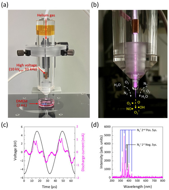 A non-thermal atmospheric pressure helium microplasma jet was used to produce PAM, as shown in Figure 1a. Details of the plasma device are described in previous reports [20,21,22,44,45,46]. In brief, the microplasma jet consisted of a 150 mm long glass tube tapered from an inner diameter of 4 mm to 680 μm at the nozzle. The glass tube (borosilicate, Pyrex; As One Co., Osaka, Japan) has a 15 mm long metallic external ring electrode wound onto the glass tube at 50 mm from the end of the nozzle. The helium gas (99.98%, industrial grade) was fed into the glass tube. A capillary dielectric barrier discharge (DBD) microplasma shown in Figure 1b was generated when a sinusoidal high voltage of 10 kVp-p (peak-to-peak) was applied to the external electrode at a fixed frequency of 33 kHz. The voltage and discharge current waveforms are shown in Figure 1c. From the voltage and current waveforms, the peak power of approximately 5 W was estimated. The typical optical emission spectrum, which shows mainly N2* second positive system, N2+ first negative system, and a very weak emission peak of OH radical in Figure 1d, was measured.