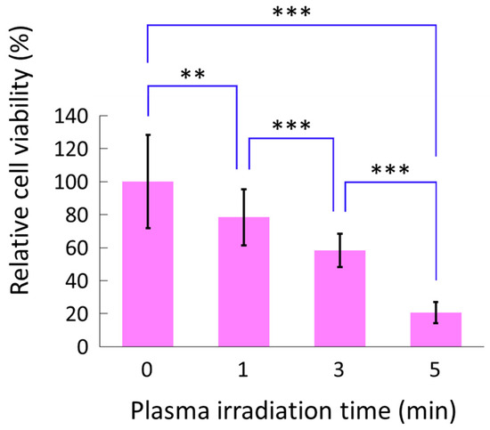 Figure 2 shows the cell viability after PAM (1, 3, and 5 min) or DMEM treatment. Cell viability after PAM treatment significantly decreased in a plasma irradiation time-dependent manner compared with that after DMEM treatment. PAM (5 min) reduced cell viability to approximately 21% of that of the control (p < 0.001).