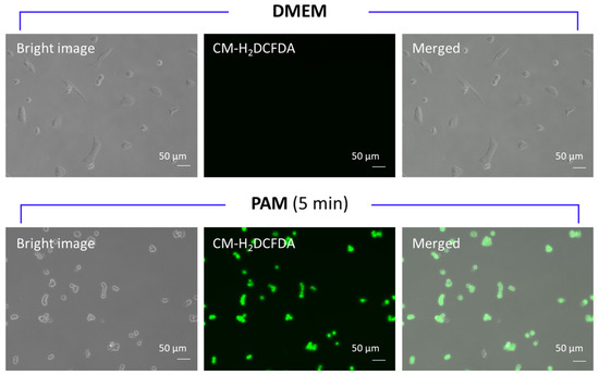 To detect the intracellular ROS accumulation, 5-6-chloromethyl-2′,7′-dichlorodihydrofluorescein diacetate, acetyl ester (CM-H2DCFDA; Invitrogen, Thermo Fisher Scientific), an intracellular ROS detection reagent, was used. The cells were seeded in a 12-well plate at a density of 5 × 104 cells/well in 1 mL of DMEM and cultured for 24 h. After 24 h incubation, the media in all wells were replaced with 1 mL of CM-H2DCFDA solution (10 µM, dissolved in phosphate-buffered saline [PBS]), and the cells were incubated for an hour in a dark place. Then, the CM-H2DCFDA solution was removed from all the wells, and the cells were cultured in 1 mL of PAM (5 min) or DMEM for 2 h in the dark. After the media in all the wells were replaced with 1 mL of DMEM, the cells were cultured for another 2 h. Next, the cells were observed using a BZ-X810 fluorescence microscope (Keyence, Osaka, Japan). Five fields per well were randomly selected, and the intracellular fluorescence intensity per cell was measured using the BZ-X Analyzer software version 1.1.1.8 (Keyence).