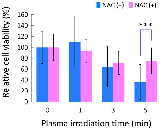HS-SY-II cell viability after PAM or DMEM treatment with and without NAC, an intracellular ROS scavenger. The cell viability after each PAM treatment was normalized with that after the DMEM treatment. *** p < 0.001, Mann–Whitney U test vs. cell viability after each PAM treatment without NAC. PAM, plasma-activated medium; DMEM, Dulbecco’s modified Eagle medium; NAC, N-acetyl-L-cysteine; ROS, reactive oxygen species.