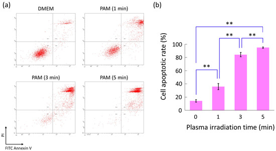 Figure 5a shows representative dot plots of the cells stained with Annexin V and PI after PAM or DMEM treatment, and Figure 5b shows the apoptotic rate of these cells. The cell apoptotic rate after PAM treatment significantly increased in a plasma irradiation time-dependent manner compared with that after DMEM treatment. In particular, PAM (5 min) significantly increased cell apoptosis compared with DMEM (p = 0.0025) and finally induced apoptosis in approximately 95% of the cells.